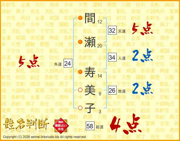 間(12画)瀬(20画) 寿(14画)美(9画)子(3画)