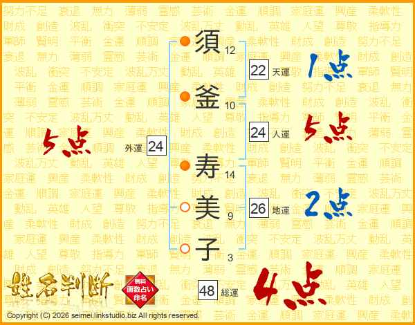 須(12画)釜(10画) 寿(14画)美(9画)子(3画)