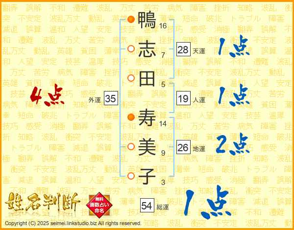 鴨(16画)志(7画)田(5画) 寿(14画)美(9画)子(3画)