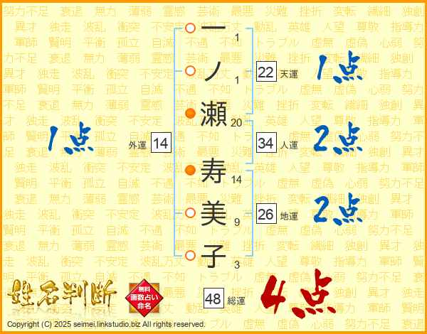 一(1画)ノ(1画)瀬(20画) 寿(14画)美(9画)子(3画)