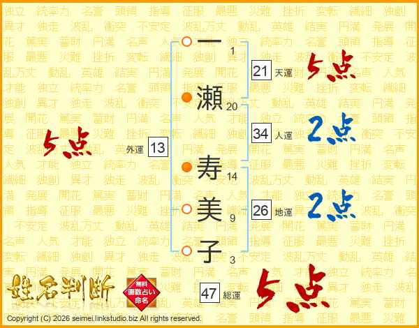 一(1画)瀬(20画) 寿(14画)美(9画)子(3画)