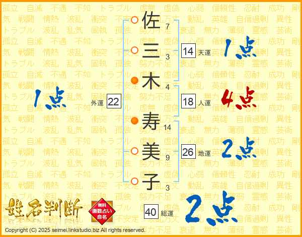 佐(7画)三(3画)木(4画) 寿(14画)美(9画)子(3画)