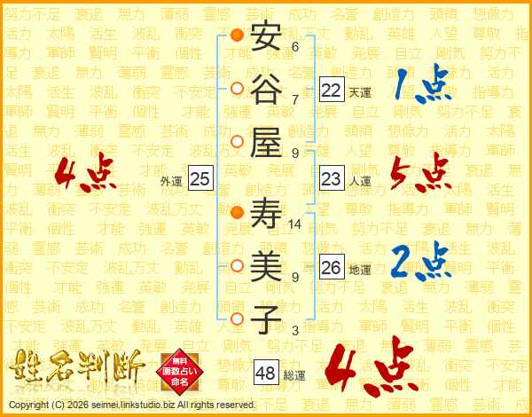 安(6画)谷(7画)屋(9画) 寿(14画)美(9画)子(3画)