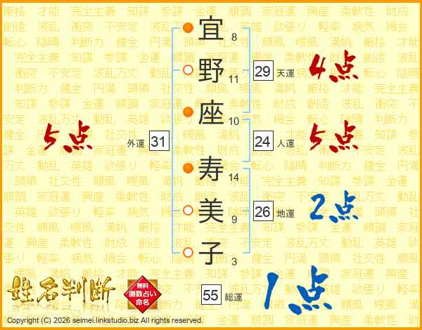 宜(8画)野(11画)座(10画) 寿(14画)美(9画)子(3画)