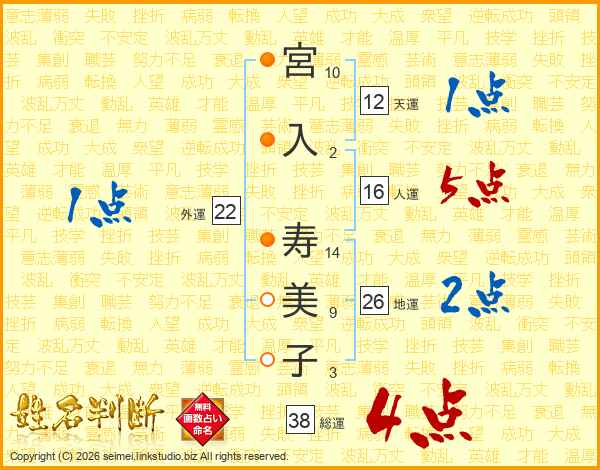 宮(10画)入(2画) 寿(14画)美(9画)子(3画)