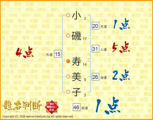 小(3画)磯(17画) 寿(14画)美(9画)子(3画)