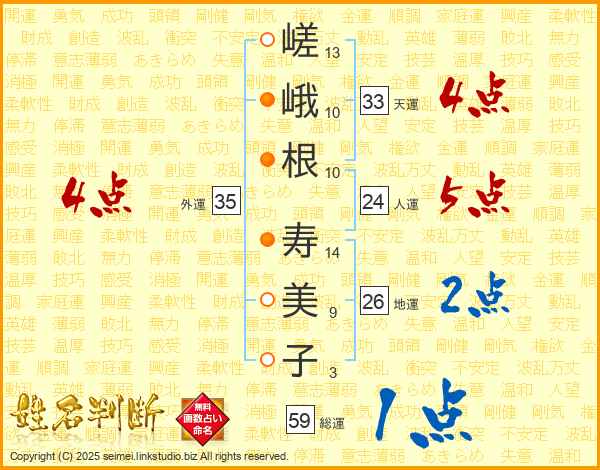 嵯峨根寿美子さんの総運は59画の1点
