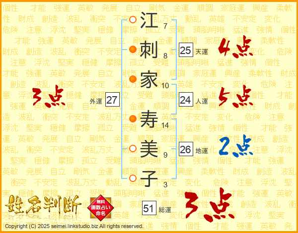江(7画)刺(8画)家(10画) 寿(14画)美(9画)子(3画)
