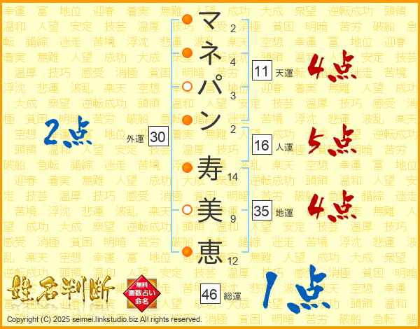 マ(2画)ネ(4画)パ(3画)ン(2画) 寿(14画)美(9画)恵(12画)