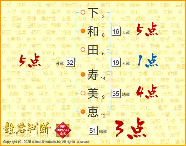 下(3画)和(8画)田(5画) 寿(14画)美(9画)恵(12画)