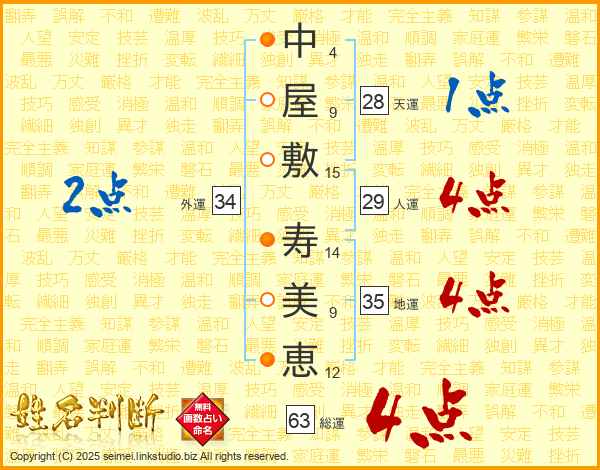 中(4画)屋(9画)敷(15画) 寿(14画)美(9画)恵(12画)