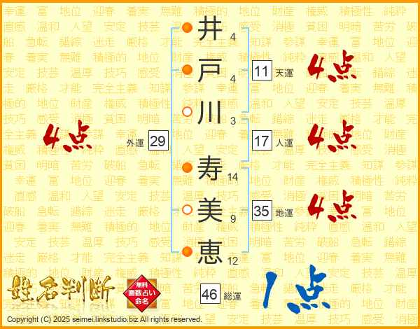 井(4画)戸(4画)川(3画) 寿(14画)美(9画)恵(12画)