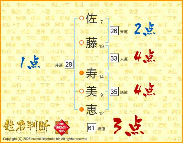 佐(7画)藤(19画) 寿(14画)美(9画)恵(12画)