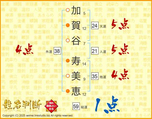 加(5画)賀(12画)谷(7画) 寿(14画)美(9画)恵(12画)