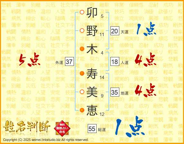 卯(5画)野(11画)木(4画) 寿(14画)美(9画)恵(12画)