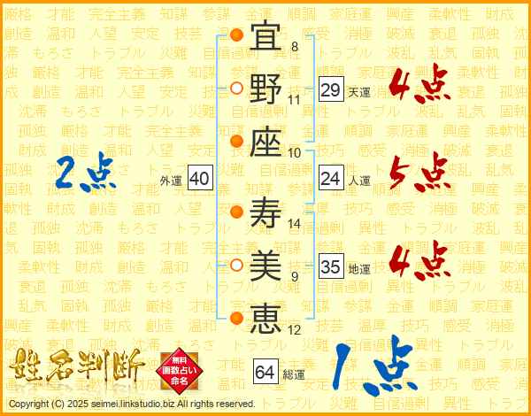 宜(8画)野(11画)座(10画) 寿(14画)美(9画)恵(12画)