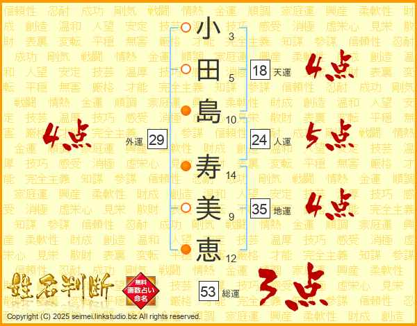 小(3画)田(5画)島(10画) 寿(14画)美(9画)恵(12画)