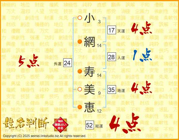小(3画)網(14画) 寿(14画)美(9画)恵(12画)
