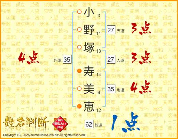 小(3画)野(11画)塚(13画) 寿(14画)美(9画)恵(12画)