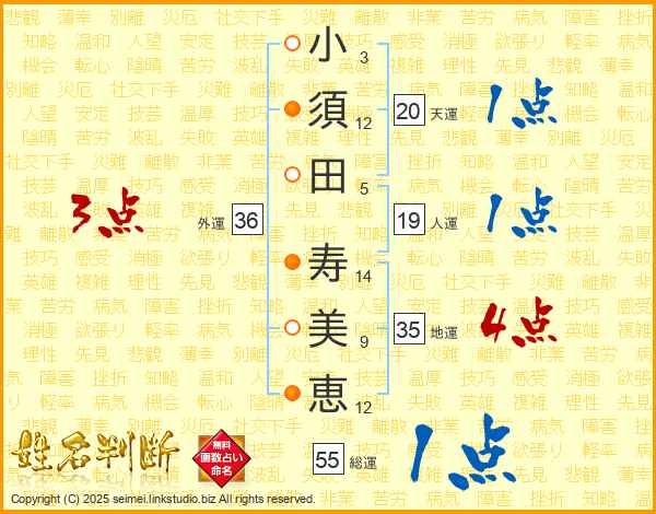 小(3画)須(12画)田(5画) 寿(14画)美(9画)恵(12画)
