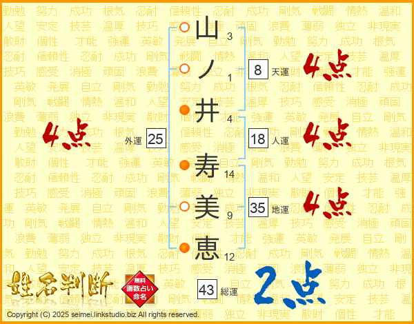 山(3画)ノ(1画)井(4画) 寿(14画)美(9画)恵(12画)
