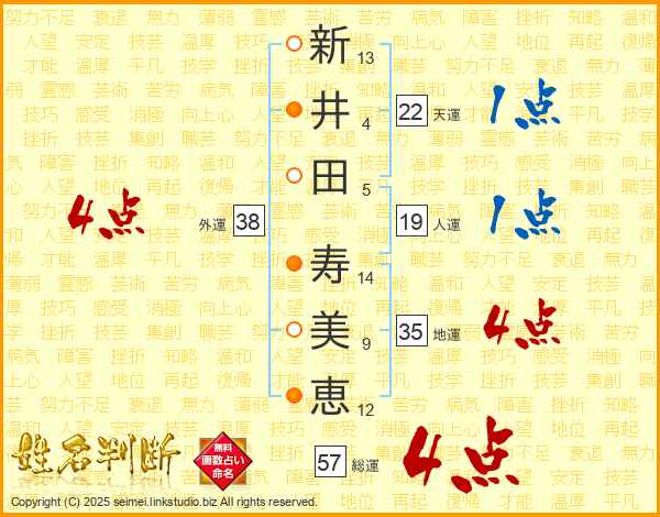新(13画)井(4画)田(5画) 寿(14画)美(9画)恵(12画)