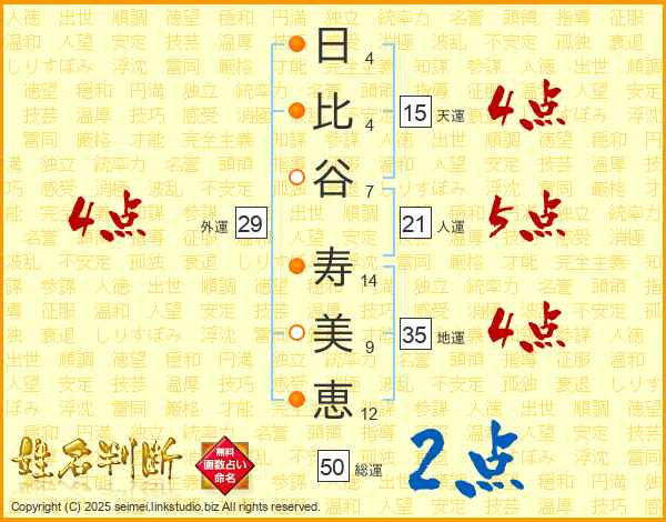 日(4画)比(4画)谷(7画) 寿(14画)美(9画)恵(12画)
