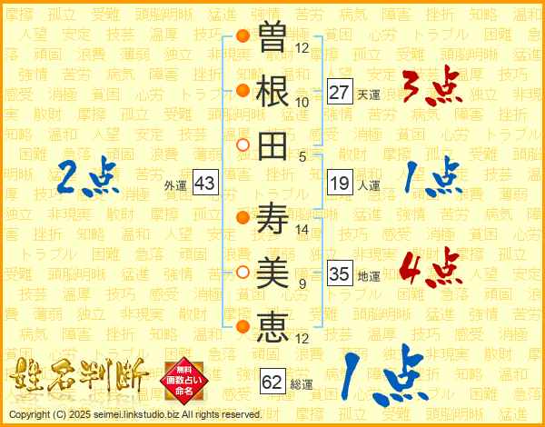 曽(12画)根(10画)田(5画) 寿(14画)美(9画)恵(12画)
