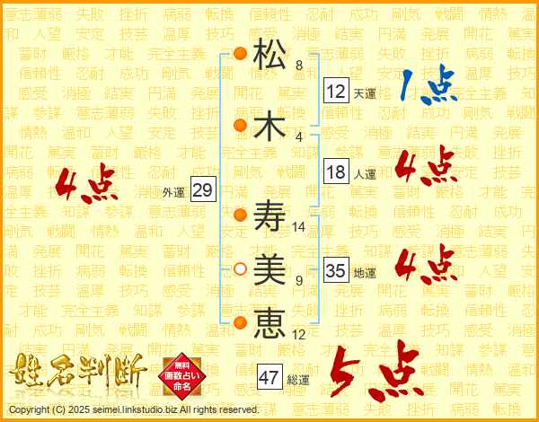 松(8画)木(4画) 寿(14画)美(9画)恵(12画)