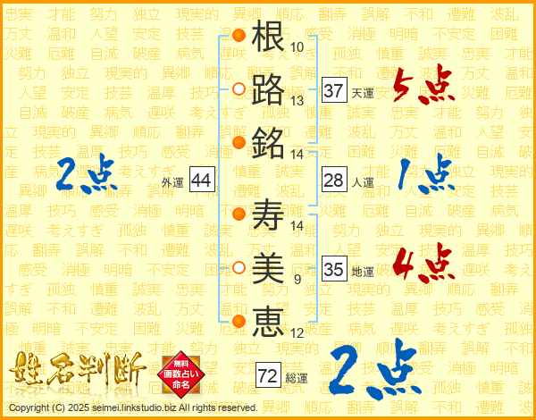 根(10画)路(13画)銘(14画) 寿(14画)美(9画)恵(12画)