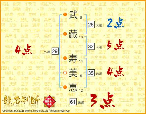 武(8画)藏(18画) 寿(14画)美(9画)恵(12画)