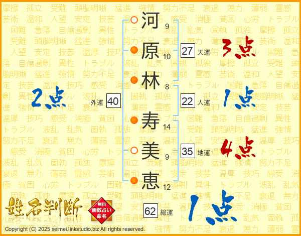 河(9画)原(10画)林(8画) 寿(14画)美(9画)恵(12画)
