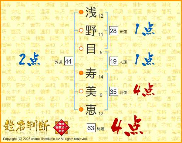 浅(12画)野(11画)目(5画) 寿(14画)美(9画)恵(12画)