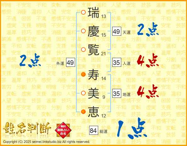 瑞(13画)慶(15画)覧(21画) 寿(14画)美(9画)恵(12画)