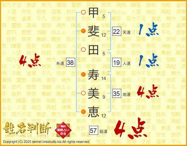 甲(5画)斐(12画)田(5画) 寿(14画)美(9画)恵(12画)