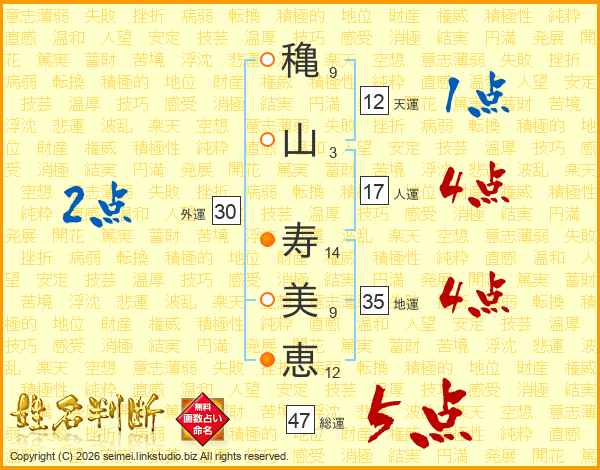 穐(9画)山(3画) 寿(14画)美(9画)恵(12画)