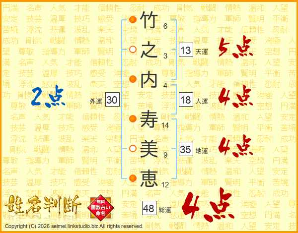 竹(6画)之(3画)内(4画) 寿(14画)美(9画)恵(12画)