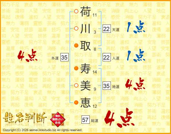 荷(11画)川(3画)取(8画) 寿(14画)美(9画)恵(12画)