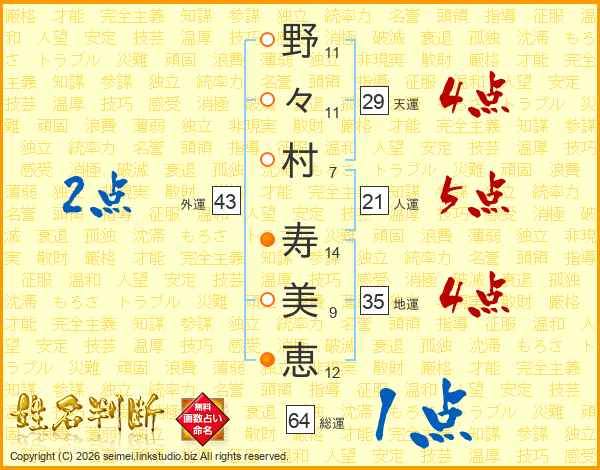 野(11画)々(11画)村(7画) 寿(14画)美(9画)恵(12画)