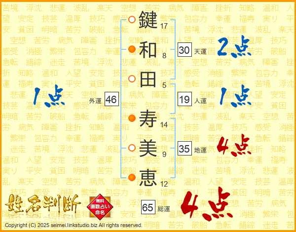 鍵(17画)和(8画)田(5画) 寿(14画)美(9画)恵(12画)