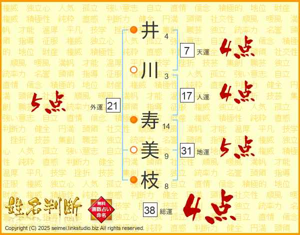 井(4画)川(3画) 寿(14画)美(9画)枝(8画)