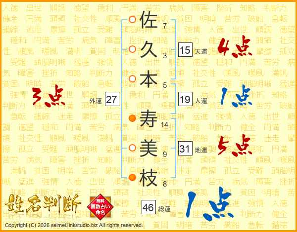 佐(7画)久(3画)本(5画) 寿(14画)美(9画)枝(8画)