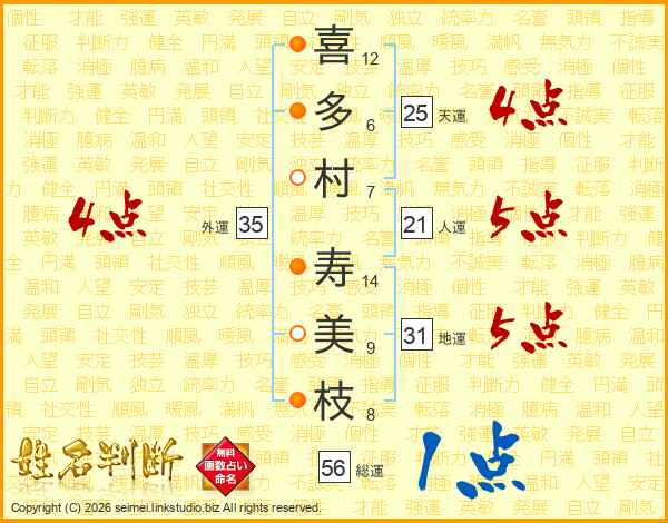 喜(12画)多(6画)村(7画) 寿(14画)美(9画)枝(8画)