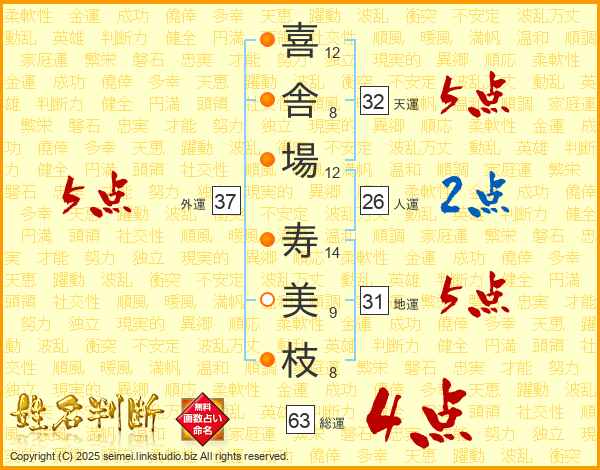 喜(12画)舎(8画)場(12画) 寿(14画)美(9画)枝(8画)