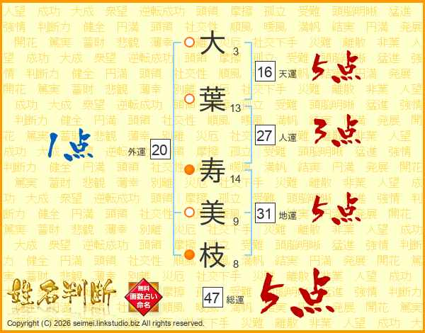 大(3画)葉(13画) 寿(14画)美(9画)枝(8画)