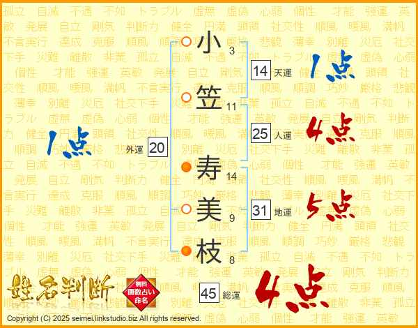 小(3画)笠(11画) 寿(14画)美(9画)枝(8画)