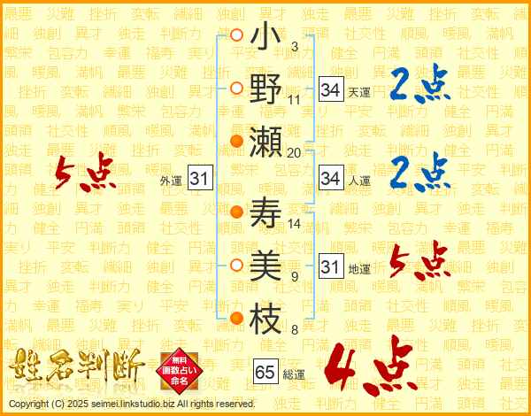 小(3画)野(11画)瀬(20画) 寿(14画)美(9画)枝(8画)