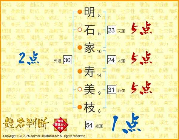 明(8画)石(5画)家(10画) 寿(14画)美(9画)枝(8画)