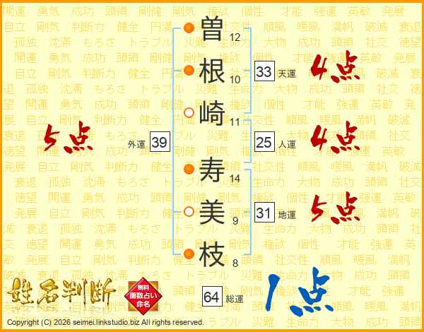 曽(12画)根(10画)崎(11画) 寿(14画)美(9画)枝(8画)