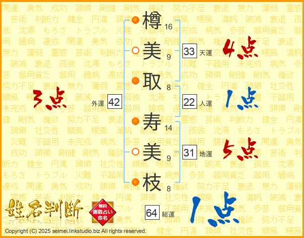 樽(16画)美(9画)取(8画) 寿(14画)美(9画)枝(8画)